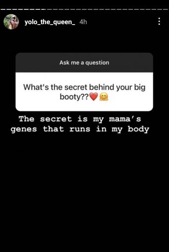 Ku munsi w’ejo ubwo Yolo The Queen yabazwagwa ibibazo bitandukanye n’abafana be binyuze kuri story ya instagram ye, umwe mu bafana be yamubajije ibanga yakoresheje kugirango agire ikibuno kinini.