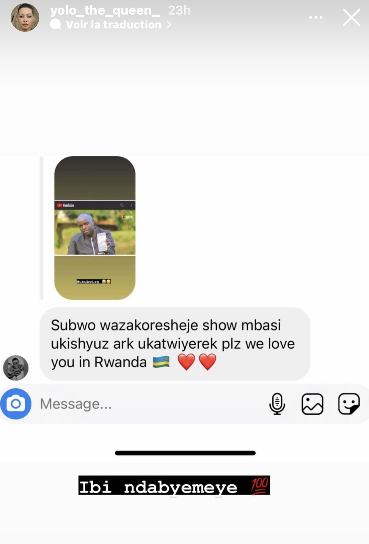 Yolo The Queen yemeye ko agiye kwiyerekana nyuma yuko umwe mu bafana be amubajije agira ati « Subwo wazakoresheje show basi ukishyuz ari ukatwiyerek plz we love you in Rwanda 🇷🇼 ❤️❤️ ».