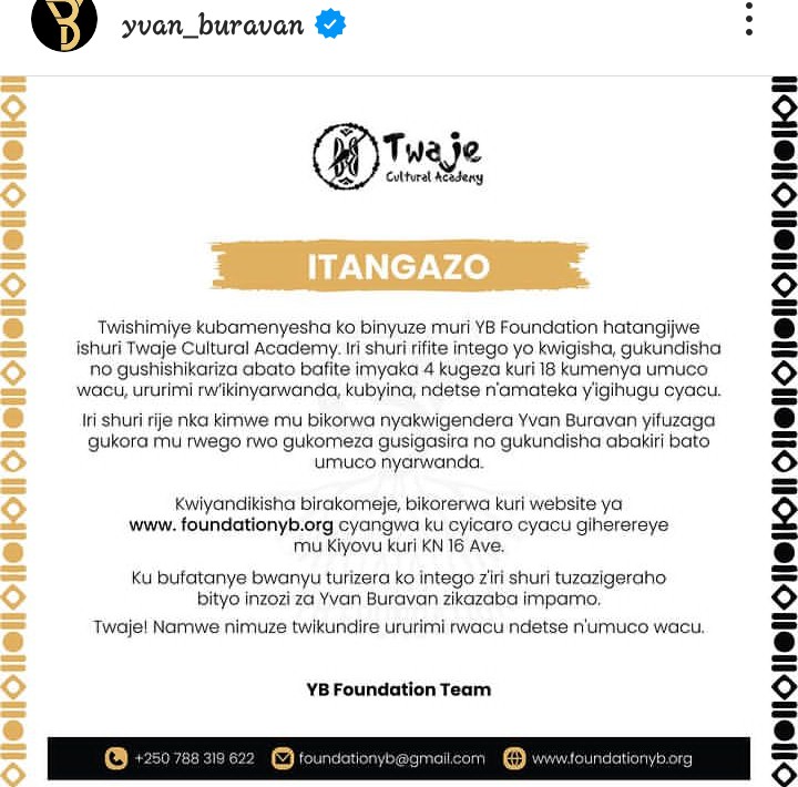 Umuryango wa Nyakwigendera Yvan Buravan watangije ishuri ryiswe “Twaje Cultural Academy”, igitekerezo cya Nkongi Cyane.
