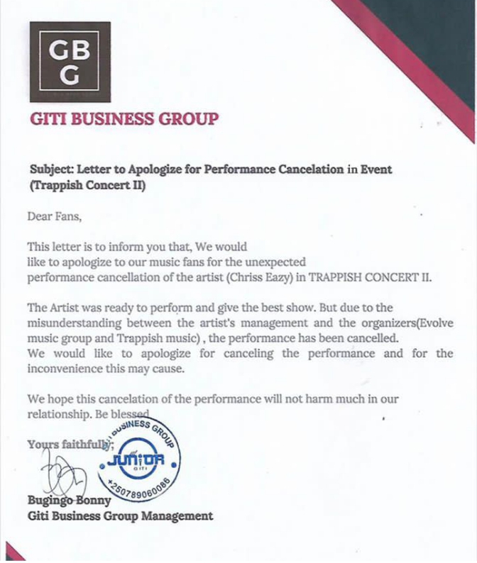 Ubuyobozi bwa Junior Giti Group, bwatangajeko umuhanzi wabo Chris Eazy, atazitabira kino gitaramo yari ategerejwemo bikomeye n’abafana be bamukunda bari baramaze kugira amatike.
